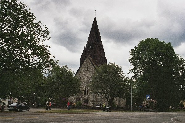 Im Vorbeifahren sahen wir einige Wohnmobile am Ufer des gegenüber liegenden Sees stehen, dann kam auch schon der Turm der sehenswerten Vanskyrkja in Sicht. Wir beschlossen, uns einen Parkplatz zu suchen und hier Mittagspause zu machen. Nach einer Runde durch die Stadt drehten wir um und suchten die Zufahrt zu dem Uferplatz, die wir hinter einer Tankstelle fanden. Einen Hinweis auf Parkgebühren gab es nicht, nur ein „No Camping“-Schild stand auf dem Platz, aber wir wollten ja hier nicht übernachten. Also stellten wir unser Fahrzeug hier ab und machten uns zu einem kleinen Stadtbummel auf.