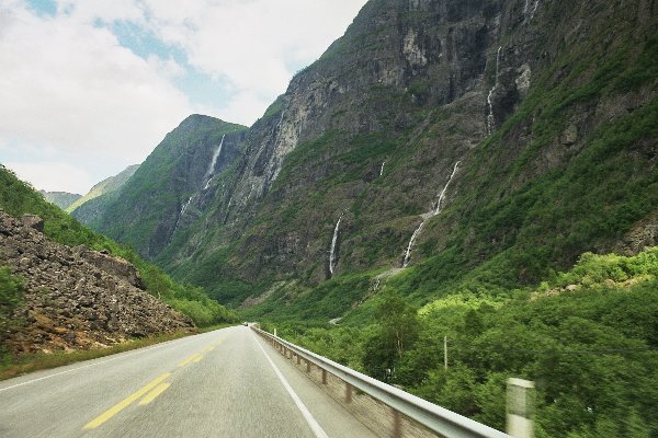Die Straße führte durch ein Tal mit atemberaubenden Ausblicken auf die umgebenden, hohen Felswände und spektakuläre Wasserfälle. Den Abzweig zum Naerøyfjord ließen wir zunächst links liegen, da wir ohnehin in zwei Tagen wieder hier vorbei kommen würden. Kurz nach Gudvangen ging es in einen 11,2 km langen Tunnel, Vincent gab das Sekundenzählen nach einer Weile auf und konzentrierte sich lieber wieder auf seinen Film.