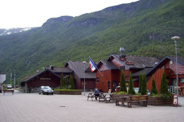 Auch am hinter dem Tunnel gelegenen Abzweig nach Undredal fuhren wir vorbei; uns zog es jetzt nach Flåm, wo wir gegen 17:30 Uhr eintrafen. Unsere erste Station war der Bahnhof, denn wir wollten uns gleich die Tickets für die Bahnfahrt am nächsten Morgen sichern. Am Kai hinter dem Parkplatz lag ein riesiges Kreuzfahrtschiff, die MSC Lirica, ein weiteres (die Mona Lisa) wartete bereits weiter draußen im Fjord. Wir sahen dem Treiben zwischen Kai und Bahnhof eine Weile zu, als auf einmal Hektik auf dem Parkplatz ausbrach, Leute wild gestikulierend umher liefen und telefonierten. Als wir uns umdrehten, sahen wir den Grund für die Aufregung: Offensichtlich hatte es gerade einen heftigen Steinschlag am gegenüberliegenden Hang gegeben. An der Staubwolke konnten wir noch erkennen, wo die Felsbrocken oberhalb des Campingplatzes abgerutscht und in die Tiefe gestürzt waren. Zwischen dem Hang und den Campern lagen aber noch eine Senke und die breite Straße, so dass den Menschen keine Gefahr drohte. Da in der Zwischenzeit mehr und mehr Wohnmobile in den Ort kamen, beschlossen wir, uns erst einmal einen Stellplatz zu sichern.