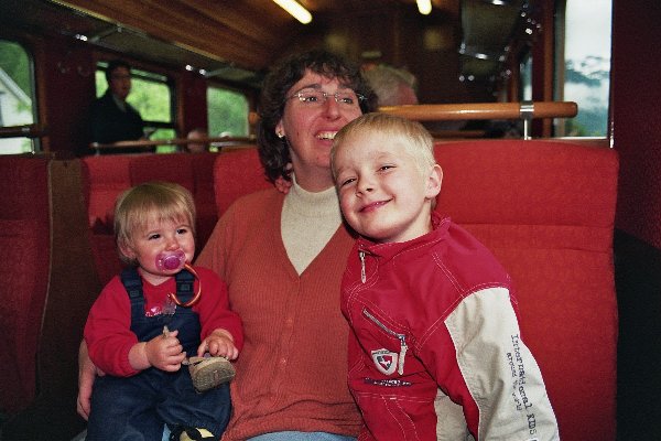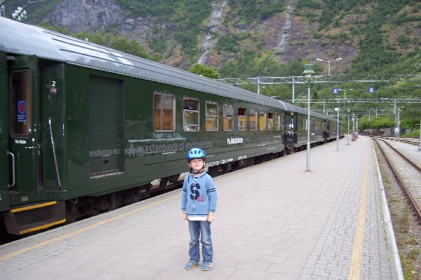 Als um 7:30 Uhr der Wecker die Nacht für uns endgültig beendete, war von Wetterbesserung leider keine Spur. Auf dem Weg zum Waschraum erkundigte sich Andreas an der Rezeption nach der aktuellen Prognose, diese versprach zwar nachlassende Schauer, erwies sich allerdings als äußerst schwammig… Also entwarfen wir während des Frühstücks einen Alternativplan, der ohne Fahrräder auskam und stattdessen unsere Regenkleidung sowie einmal mehr Lisas Tragekraxe ins Spiel brachte: Wir wollten den Zug nach Myrdal nehmen, dann so weit wie möglich das Tal hinab laufen und irgendwo auf dem Rückweg wieder in die Flåmbahn einsteigen. Gesagt - getan; während Doreen noch das Frühstücksgeschirr wegräumte und die Fotoausrüstung zusammenpackte, lief Andreas mit Vincent und Lisa bereits zum Bahnhof und tauschte dort die Einwegtickets inkl. Fahrradtransport gegen ein Familienticket für Hin- und Rückfahrt ein. Das klappte reibungslos und wir bekamen sogar noch 10 NOK heraus. Inzwischen kam Doreen mit Rucksack, Foto- und Videokamera nach und wir warfen noch einen flüchtigen Blick auf die heute am Kai liegende MS Discovery, bevor wir uns in die Schlange der auf die Abfahrt des Zuges Wartenden einreihten.