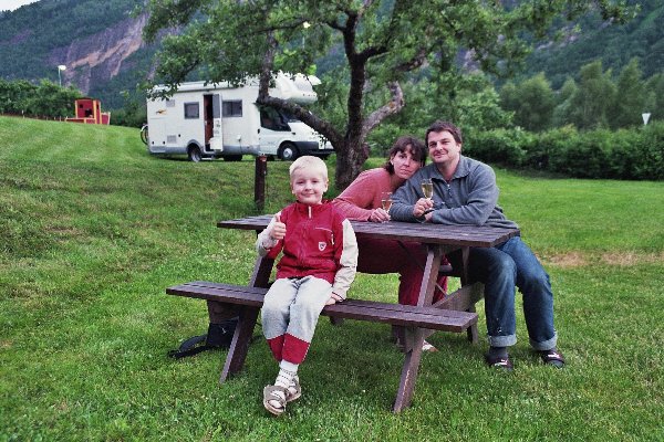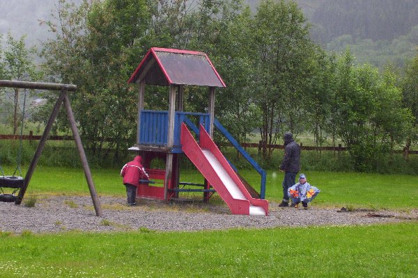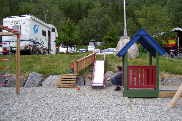 Der Platz war wunderschön terrassenförmig angelegt und bot einen tollen Blick auf die umliegenden Felsen. Für die Kinder gab es auf dem Spielplatz unter anderem ein Trampolin, so dass sie endlich wieder hopsen konnten. Das war genau das Richtige nach dem langen Tag im Wohnmobil und so ging Doreen mit Lisa und Vincent spielen, während Andreas noch die Markise aufbaute und das Stromkabel vom Verteiler zum Wohnmobil zog. Anschließend erkundeten wir gemeinsam den Spielplatz, probierten auch die Rutsche, den Sandkasten sowie weitere Schaukeltiere aus und unterhielten uns eine Weile mit einem Schweizer, den wir bereits auf dem Zeltplatz in Haukeland und auf dem Fischmarkt in Bergen getroffen hatten.