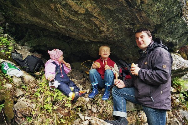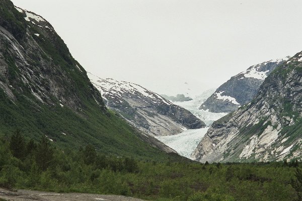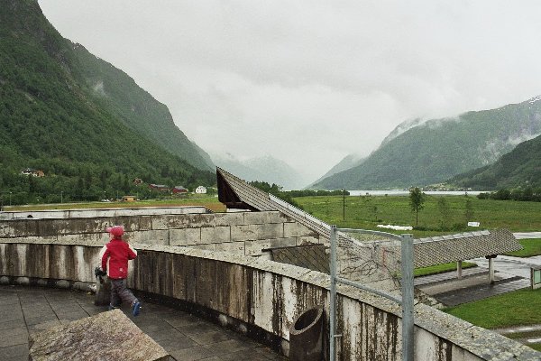 Gegen 11 Uhr verließen wir schließlich den Zeltplatz und fuhren das kurze Stück zum Norsk Breenmuseum hinüber. Als wir das Museum betraten, begann gerade ein Film über die Gletscherzungen des Jostedalsbreen und wir setzten uns mit in den Saal. Auf der gewölbten Leinwand sahen die Bilder von Expeditionen und Hubschrauberflügen natürlich besonders beeindruckend aus, für die Kinder waren sie aber doch ein wenig zu gewaltig und so verließen wir die Vorführung vorzeitig und sahen uns ausgiebig das sehr interessant gestaltete Museum an. Es gab eine Menge über die Entstehung von Gletschern sowie die Eigenschaften von Eis und Wasser zu erfahren. Für die Kinder gab es viele Exponate zum Ausprobieren und Untersuchen, was natürlich besonders Spaß machte. So konnte man zum Beispiel an einer Handpresse selbst herausfinden, wie sich Eis unter hohem Druck verhält, die schmirgelnde Wirkung von Eis und Geröll auf anderem Gestein untersuchen, Aufbau und Funktionsweise eines Gletscherkraftwerkes betrachten und sogar durch eine nachgestaltete Gletscherspalte laufen. Für die Erwachsenen war unter anderem der Vergleich von Alter und Größe des Sognefjordes gegenüber dem Grand Canyon in den USA interessant… Zum Abschluss stiegen wir noch auf das Dach des Museums, von wo aus man eigentlich einen guten Blick auf viele umliegende Berge haben sollte, die anhand einiger Tafeln näher erläutert wurden. Leider hingen die Wolken aber so tief im Tal, dass man von der tollen Umgebung gar nicht viel sehen konnte.