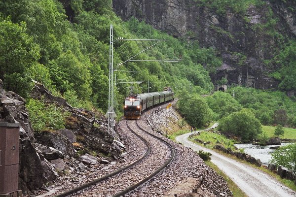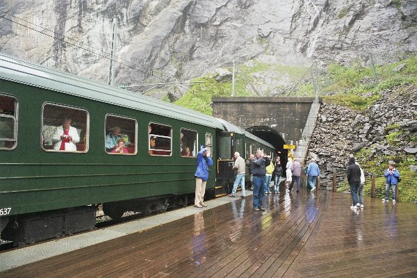 Punkt 11:00 Uhr setzte sich die Bahn in Bewegung und schlängelte sich entlang der steilen Trasse bergauf. Die beeindruckenden Ausblicke auf das Tal und unzählige Wasserfälle wurden immer wieder durch kürzere oder längere Tunnel unterbrochen und auch sonst nahm das Regenwetter vielen Panoramen den Reiz. Auf halber Strecke, bei Berekvam, gab es einen Halt, da nur hier die Strecke zweigleisig war und das Passieren des Zuges aus der Gegenrichtung ermöglichte. Ein weiterer fünfminütiger Stopp wurde am Kjosfossen, einem spektakulären Wasserfall direkt hinter einem Tunnel, gemacht. Hier gab es eine kurze musikalische Einlage, bei der eine Tänzerin am Wasser und auf der daneben stehenden Ruine umher wandelte.