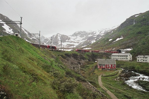 Es vergingen einige bange Minuten, dann hörten wir den Zug hupen und Andreas ging vor die Hütte, um auf uns aufmerksam zu machen. Zu unserer großen Überraschung kam der Zug jedoch nicht von Myrdal, sondern von Flåm. Da sich das einzige zweigleisige Stück in Berekvam befindet, bedeutete dies, dass in den nächsten Minuten kein Zug in der Gegenrichtung zu erwarten war. Irgendetwas stimmte offenbar mit dem Fahrplan nicht. Wie auch immer, der Zug hielt und der Zugbegleiter fragte, ob wir mitfahren wollten. Wir verneinten, meldeten aber unser Zusteigen für die Rückfahrt an.