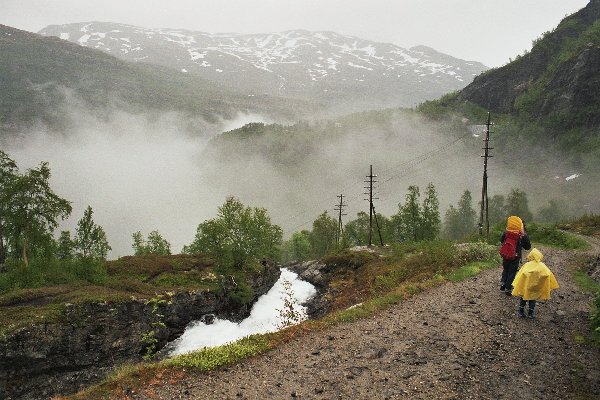 Durch einige weitere Tunnel, die zum Teil 360° durch den Berg führten und Fenster nach draußen hatten, gelangten wir schließlich zur Endstation. Gegen 12 Uhr hatten wir den Bahnhof von Myrdal erreicht, wo ein ziemliches Gedränge herrschte. Die meisten Fahrgäste blieben zur Rückfahrt im Zug sitzen, andere stiegen aus, um in die auf dem Nachbargleis wartende Bergenbahn umzusteigen. Wir setzten Lisa in ihre Trage, zogen die Regenjacken über und brachen gegen 12:15 Uhr zur Wanderung ins Tal auf. Zunächst mussten wir dem Bahnsteig bis zum Ende folgen und dann die Gleise überqueren, um zum Anfang des Wanderweges zu gelangen.