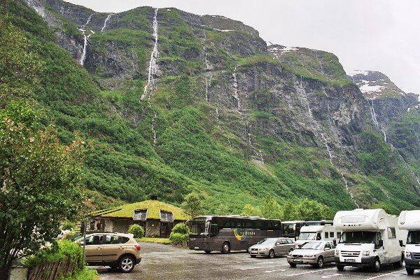 Es ging zurück durch die langen Tunnel, die wir vorgestern bereits in der anderen Richtung passiert hatten. Obwohl wir früh dran waren, ließen wir den Abstecher zur Stabkirche nach Undredal erneut aus. Wir werden in den nächsten Tagen noch mehrere Gelegenheiten haben, andere Stabkirchen zu sehen. Der Platz auf der Fähre war uns im Moment einfach wichtiger. Um 10 Uhr erreichten wir die Anlegestelle in Gudvangen, unsere Fähre ging um 12 Uhr und wir waren das dritte Fahrzeug in der Reihe. Die Wartezeit überbrückten wir, indem wir die Tourbusse beobachteten, die Fahrgäste für die Fähre nach Flåm brachten.