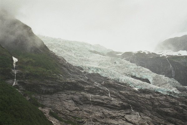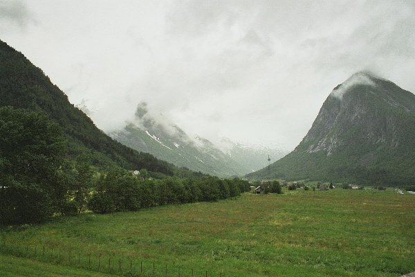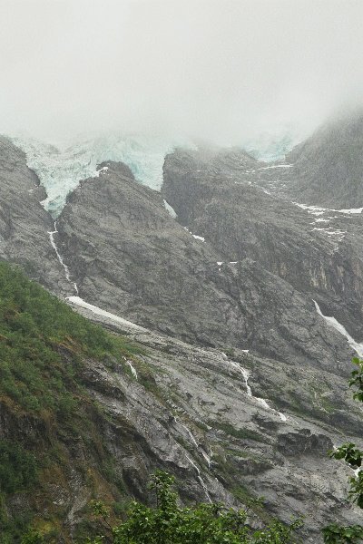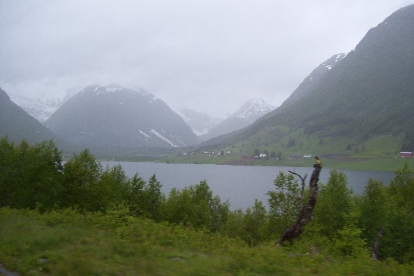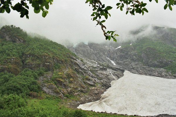 Leider zog der Dunst aber immer weiter herab, so dass sich die Sicht mehr und mehr verschlechterte. Also kehrte Andreas rasch zum Wohnmobil zurück und nachdem auch Doreen noch einen kurzen Blick auf den wolkenverhangenen Gletscher geworfen hatten, kehrten wir zur Hauptstraße zurück. Wir zahlten an der Mautstation in Fjærland nochmals 175 NOK und fuhren wieder nach Sogndal. Als wir den Bergetunnel passiert hatten, ließ der Regen allmählich nach; später kamen sogar vereinzelt sonnige Abschnitte dazu. Lisa war inzwischen wieder eingeschlafen, daher ging Doreen in Sogndal rasch allein in den Supermarkt, um Milch, Brot und andere Dinge des täglichen Bedarfs zu besorgen. Es folgte noch ein kurzer Tankstopp, bevor es auf der E5 weiter in Richtung Gaupne ging.