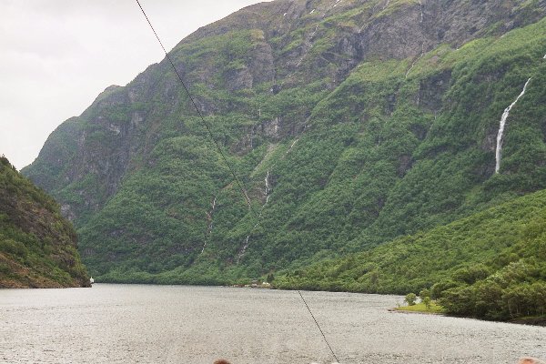 Dann fuhren wir in den wesentlich breiteren Sognefjord ein, über den in spektakulärer Weise eine Hochspannungsleitung verlief.