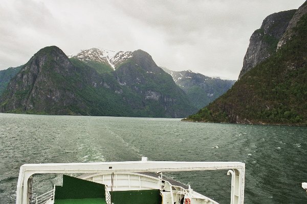 So verging die Zeit allmählich und uns kam der Gedanke, dass wir durch die Überfahrt heute keine Gelegenheit hätten, im Wohnmobil Mittagessen zu kochen. Als die Fähre gegen 11:40 Uhr anlegte, schmierte Doreen deshalb rasch noch einige Schnittchen und kochte ein paar Eier, die wir als Schnellimbiss verzehrten. Kurz darauf begann das Boarden und wir brachten gerade so die 760 NOK für die Überfahrt in Bar zusammen; Zahlung mit Karte war leider nicht möglich. Dann ging alles ganz schnell und während Andreas mit der Fotoausrüstung noch den Blick auf Gudvangen festhalten wollte, legte die Fähre bereits ab. Als er zurück zum Wohnmobil kam, war die Stimmung auch etwas gereizt, schließlich wollten Doreen und die Kinder auch etwas von der Landschaft sehen und nicht nur die Wände des Schiffsrumpfes. Wir zogen uns rasch die Jacken über und gingen dann hinauf auf das Oberdeck. Die Fahrt durch den schmalen Nærøyfjord war sehr beeindruckend.