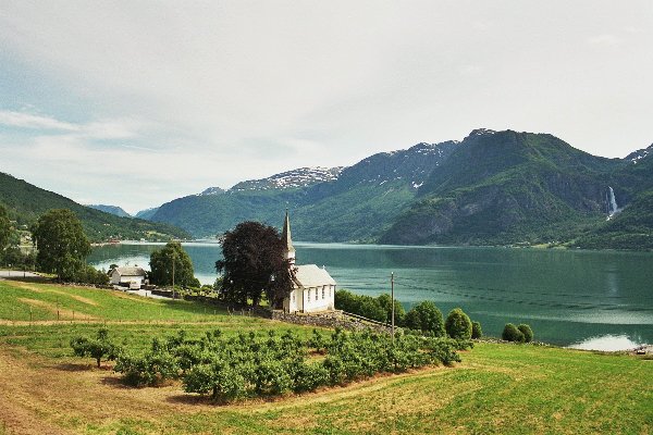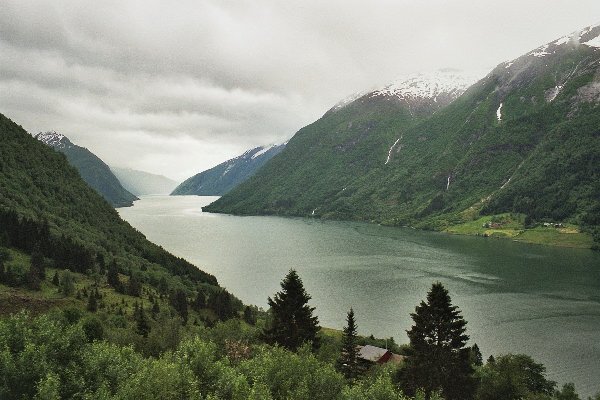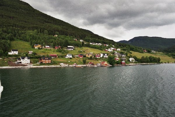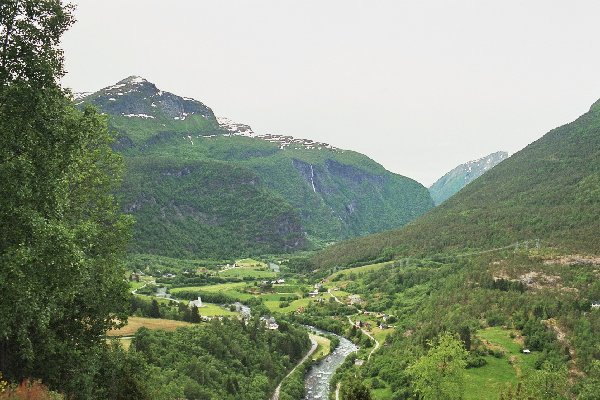 Nach einem kurzen Stopp, bei dem die Kinder das Fahrzeug nicht mal verließen, fuhren wir weiter, zunächst bergauf, bis sich die Straße mit wundervollen Ausblicken auf Sogndal wieder hinab zum Fjord schlängelte. Schade war nur, dass wir keinen schönen Haltepunkt mit freiem Blick fanden, aber an jedem Parkplatz waren die Bäume so hoch gewachsen, dass sie die Sicht auf den Fjord versperrten. So fuhren wir erst einmal eine Runde durch das schöne Zentrum von Sogndal, stellten unser Fahrzeug auf den Parkplatz des RIMI-Marktes und gingen Einkaufen. Da uns durch die Überfahrt das Bargeld ausgegangen war, musste Andreas rasch am gegenüberliegenden Bankautomaten ein paar Scheine besorgen, bevor wir mit dem Einkauf zur Kasse gehen konnten. Anschließend entdeckten wir auf der anderen Straßenseite ein Postamt und nutzten die Gelegenheit, um unsere ersten Urlaubsgrüße in den Briefkasten zu werfen. Außerdem besorgten wir beim Bäcker noch frische Brötchen, Brezeln und Donuts, bevor wir unsere Fahrt fortsetzten. Ursprünglich wollten wir heute auf einem Campingplatz in Sognedal übernachten, aber es war noch so früh am Tage, dass wir beschlossen, schon heute in Richtung Fjærland zu fahren und dadurch morgen mehr Zeit für die westlichen Gletscherzungen des Jostedalsbreen zu haben.
