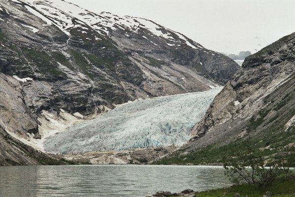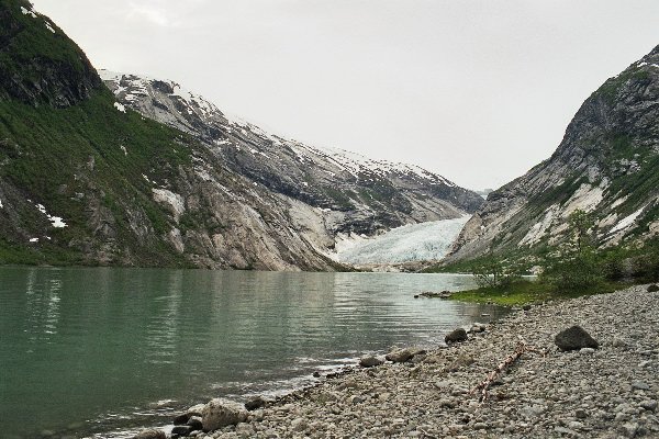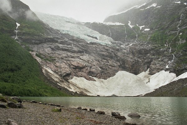Um 12 Uhr rissen wir uns endlich los, schließlich wollten wir einige Gletscherzungen heute noch im Original mit eigenen Augen sehen. Zunächst fuhren wir zum Bøyabreen und hielten kurz vor dem offiziellen Parkplatz. Das Wetter hatte bisher leider kein Einsehen mit uns und so beschlossen wir, die in Kanada bewährte Taktik zu wiederholen und erst einmal Mittagessen zu kochen. Während Lisa schlief und Doreen das Wasser für die Reisnudeln aufsetzte, erkundeten Vincent und Andreas schon mal den Weg zum Gletschersee, machten einige Foto und Filmaufnahmen und warfen Steine ins Wasser.