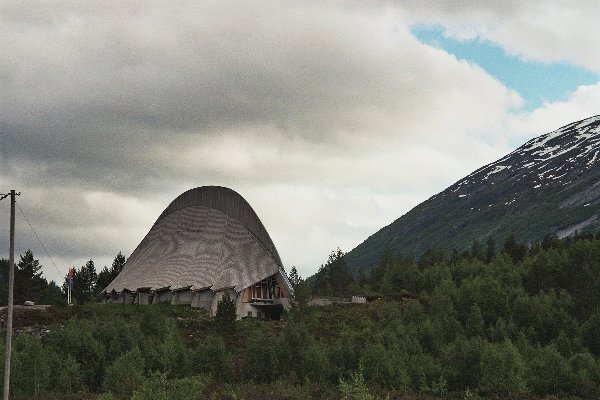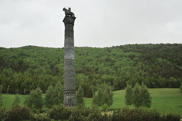 An der Sognefjellshytter wollten wir noch einmal rasten und einen Fotostopp einlegen, aber ein plötzlicher Wetterumschwung bewegte uns doch zur unverzüglichen Weiterfahrt. Wir retteten uns ins Tal und hielten kurz am Elveseter-Hotel. Das Wahrzeichen dieses, 25 Kilometer vor Lom gelegenen, Anwesens ist die 32 Meter hohe Sagasäule, auf der Szenen aus der Geschichte Norwegens von der Wikingerzeit bis zur Unabhängigkeit im Jahre 1814 dargestellt sind.