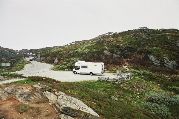 Die Fahrt über die schmale Straße hinauf und wieder zurück sowie die Bootsfahrt würden zusammen einfach zu viel Zeit beanspruchen und für Lisa und Vincent wäre das ein weiteres Mal sicher auch zu langweilig. Wir machten eine kurze Snackpause und fuhren anschließend zurück nach Gaupne, doch bereits nach der ersten Rechtskurve mussten wir bereits wieder anhalten. Wie schon am Abfahrtstag in Leipzig hatten wir vergessen, den Besteckkasten zu verriegeln und so war dieser mit lautem Poltern und Rasseln wieder einmal im Gang gelandet. Als wir endlich alles wieder aufgesammelt und verstaut hatten, fuhren wir ohne weitere Zwischenfälle nach Gaupne, wo wir um 19:45 Uhr auf dem Sandvik Camping eincheckten.