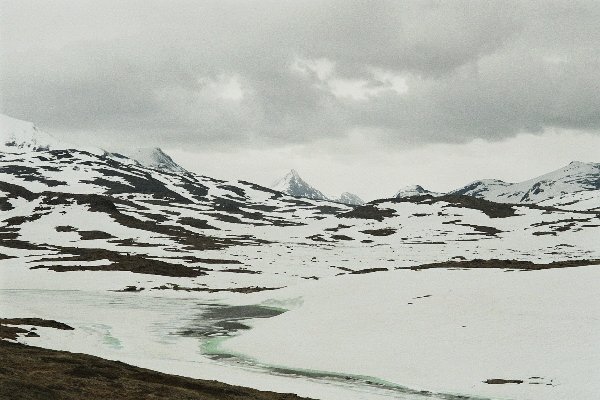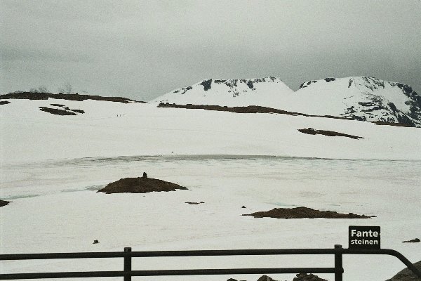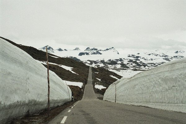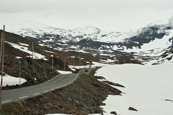 Nach dem Mittagessen und einer Tasse Kaffee fuhren wir weiter über den Sognefjellpass und erreichten den Jotunheimen Nasjonal Park. Hier oben auf dem Hochplateau des Sognefjellet lag zum Teil noch reichlich Schnee und in der Ferne konnten wir noch mehr schneebedeckte Gipfel emporragen sehen.