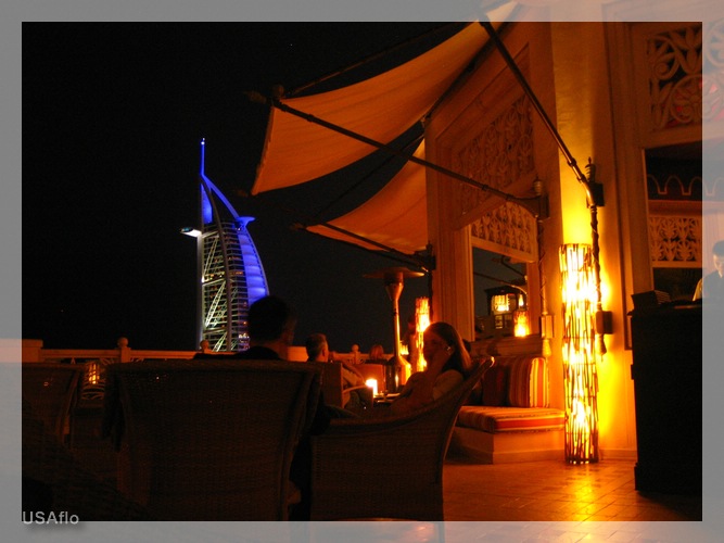 Drei Stunden verbrachten wir in der Bar. Um 19:00 Uhr fuhren wir wieder herunter und gingen die Brücke zurück zum Ausgang. Den Abend ausklingen lassen wollten wir im Madinat nebenan. Im Internet hatte ich vorher gelesen, dass kurz vor der Schranke vom Hotel kommend rechts ein Dienstweg ins Madinat führt. Eigentlich soll man dort wohl nicht lang gehen, aber es kontrollierte keiner. Also gingen wir dort lang. Kurze Zeit genangen hielt auch schon einer die Gäste des Burj und des Madinat fahrender Golfcaddy an und fragte, ob er uns mitnehmen könne. Da sagten wir natürlich nicht nein. So wurden wir entlang der eigentlich nur für Hotelgäste zugänglichen Bereiche des Madinat vorbei an den Pools und der Privatvilla des Scheichs zum Al Quasr Hotel gefahren.