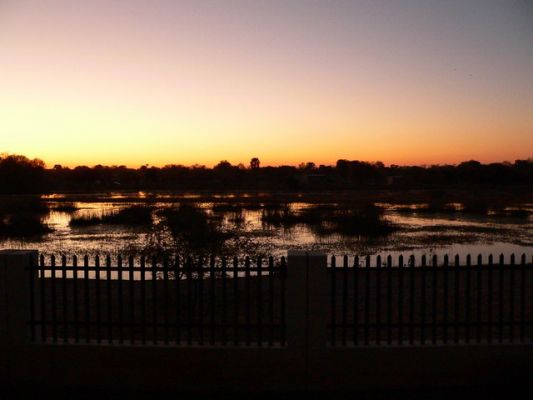 Auch das Vogelbuch kommt schon zu seinen ersten Einsätzen. Abends wird in der Boma der Grill angeschmissen, für 65 Pula kann man vom Buffet speisen.  :essen: Christian entscheidet sich dafür, während ich A-la-Carte esse. Als er sich das zweite Mal vom Buffet bedienen will, schaut der Koch schon komisch und als Christian dann das dritte Mal hingeht, gibt es ein Wortwechsel, aus dem Christian jedoch nicht entnehmen konnte, ob er einen Zettel vorlegen hätte müssen oder ob es in Botswana unüblich ist, mehrmals sich vom Buffet zu holen (zu Christians Verteidigung sei gesagt, dass die Teller nicht voll beladen waren). Wir sind auf die Rechnung gespannt, ob sein Essen doppelt berechnet wird, aber so ist es nicht.