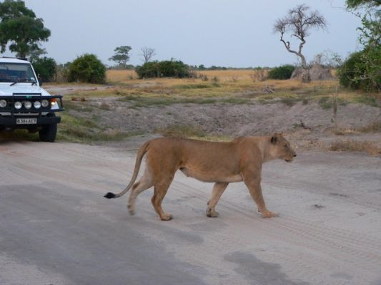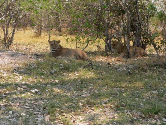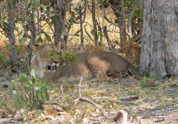 Kurz vor 15:00 h werden wir zum plötzlichen Aufbruch gedrängt, denn Chimney hat abseits der öffentlichen Pisten eine Löwenfamilie entdeckt. Keiner von uns will sich das entgehen lassen und so sind wir wenige Minuten später auf Tuchfühlung mit zwei Löwendamen, einem Pascha und zwei ca. 7-8 Monate alten Abkömmlingen.