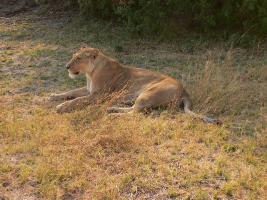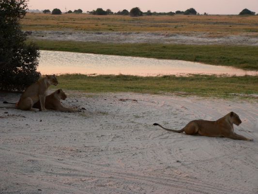 Unweit des Chobes haben sich drei Löwen niedergelassen, die nicht nur von uns beobachtet werden. Ein Löwe startet einen halbherzigen Angriff auf eine hinkende Impala-Antilope, aber offensichtlich ist er noch zu voll gefressen. Ein Riss wäre das Highlight schlechthin gewesen, aber so freue ich mich für die Impala, dass sie zumindest vorerst mit dem Leben davongekommen ist.