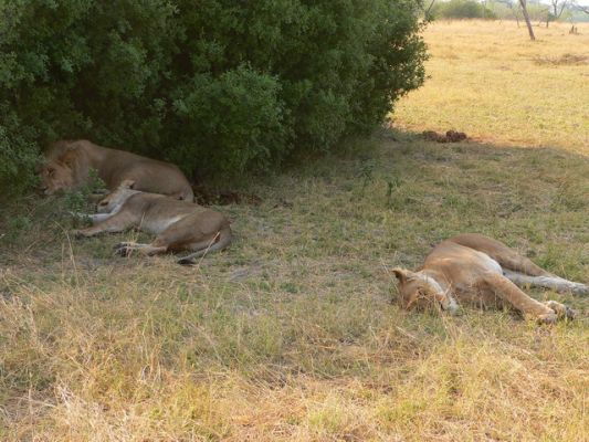 Uns ist das Glück hold, drei Löwen liegen träge unter einem Baum. Sie haben runde Bäuche, sind nicht so mager wie im CKGR.