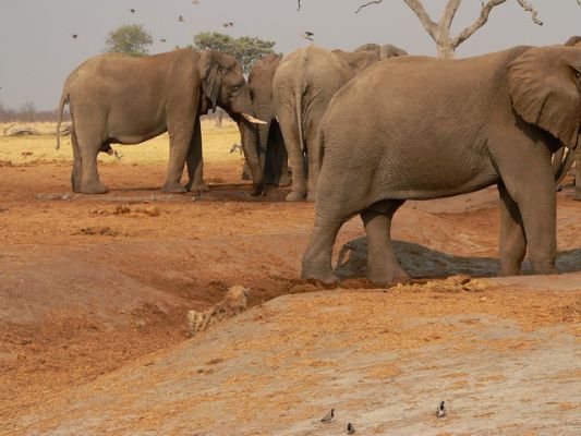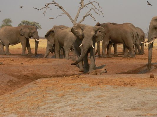 Um 15:35 h geht es auf Pirschfahrt und es geht wieder Schlag auf Schlag: ein Schwarm Rotschnabelbüffelweber, eine Herde mit ca. 30 Elefanten, Hippos, Hammerkopf, Giraffen mit Madenhackern, Moorantilopen, schlanke Manguste, Turteltauben, Hornrabe, Paviane und Schakale.