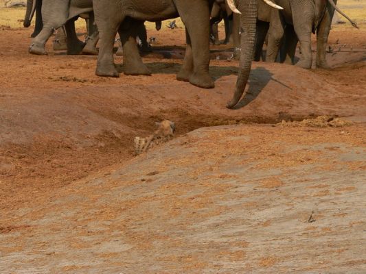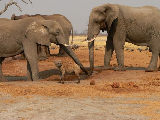 Am Wasserloch selbst ist dann auch einiges los: Elefanten, Warzenschweine, Perlhühner, ein Raubadler und nach ganz genauem Hinschauen entdecken wir in einer Kuhle eine Tüpfelhyäne, die darauf wartet, dass die Elefanten den Zufluss des Frischwassers freigeben und sie zum Zuge kommt.