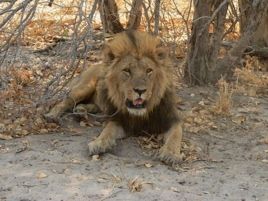 Um 08:30 h sind wir am Hippokadaver von gestern. Ein Löwe liegt links unter einem Baum, auf den Bäumen sind Marabus und Weißrückengeier sowie drei Kapgeier am Boden. In einiger Entfernung sind eine Hyäne und eine Moorantilope. Während wir beobachten, ob sich was Spannendes entwickelt, lässt uns Chimney wieder an seinem umfangreichen Wissen teilhaben: Impalas werden während des Maivollmondes befruchtet, die Geburt findet dann im November statt. Sie kann jedoch um zwei Wochen verzögert werden, wenn das Nahrungsangebot nicht zufrieden stellend ist. Eine einzelne Hyäne kann keine Moorantilope jagen. Gnus sind Wandertiere, aber nicht im Moremi, da sie hier immer genügend zu fressen haben.