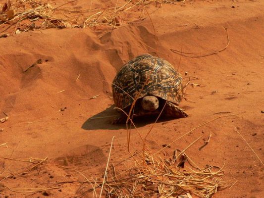 Über das Ghowa Gate verlassen wir die Savuti Region, fahren durch die Forest Reserve und auf einer sandigen Piste ist die Leopardenschildkröte nicht zu übersehen. Das ist uns einen Fotostopp wert.