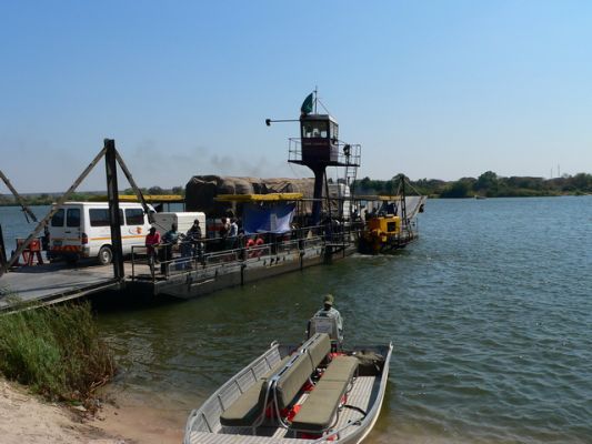 Leider sehen wir auch eine tote Giraffe und einen Elefanten, den bald das zeitliche segnen wird, da er Mühe hat, sich auf den Beinen zu halten. Dieser traurige Anblick erschwert uns zusätzlich den Abschied. Schon um 08:30 h sind wir am Flughafen von Kasane, wo wir auf den Transfer für Gabi und Frank warten, der für 09:00 h vorgesehen ist. Wir anderen sollen von Chimney direkt bis zur Fähre nach Sambia gebracht werden. Ich sehe mich ein bisschen im Flughafengebäude um, amüsiere mich über die Flugtafel, nach der fünfmal die Woche eine Maschine aus Gaborone abgeht und ankommt. An zwei Tagen finden keine Flugbewegungen statt. Als der Transfer für die beiden kommt, wird deren Gepäck verladen, dann heißt es, wir anderen sollen auch mitfahren, also auch unserer Gepäck wird umgeladen, bis dann jedoch festgestellt wird, dass der Platz nicht für das gesamte Gepäck ausreicht.  :platsch: Also muss Chimney doch mit zur Fähre fahren. Bis zur Fähre steht eine lange Lkw-Schlange. Lt. Chimneys Einschätzung müssen die Lkw-Fahrer bis zu zwei Wochen auf ihre Fähre warten.