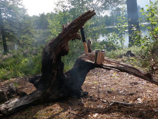 Schon früh bin ich aus den Feder, ein Kuchen will gebacken werden. Zwei meiner Gäste helfen mir, die eine sammelt Blaubeeren und die andere hilft das Lagerfeuer in Gang zu bringen. Die Ausbeute der Blaubeeren ist leider nicht besonders groß, hier sind einfach zu viele Leute unterwegs. Ohne Hordentopf (den wollte ich nicht mitschleppen) brennt mir der Kuchen natürlich auch unten und seitlich etwas an, aber man kann es abschneiden und das Geburtstagskind hat sich sehr gefreut.