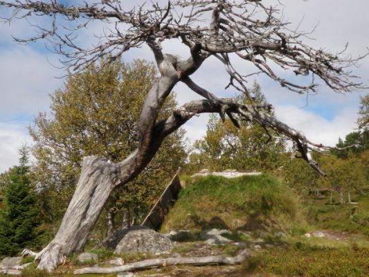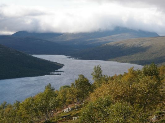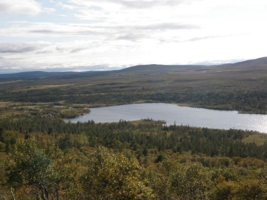 Am späten Nachmittag verabschieden wir uns herzlich von den beiden, die waren unglaublich nett. Peter lädt uns noch zu einem Vortrag von ihm am morgigen Abend in der Fjällstation ein, ein Diavortrag allerdings in schwedisch. Helena gibt uns noch einen Tip und so laufen wir noch ein Stück weiter bis wir zu einem herrlichen Aussichtsplatz kommen. Von hier hat man einen tollen Blick auf den See Grövelsjön. (An diesem Punkt werden auch gerne Hochzeiten gehalten wie wir erfahren haben)