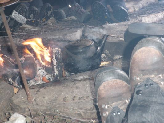 Am letzten Tag wird die Ausrüstung immer komplett gereinigt und da ich noch zum Einkaufen (für den Abschiedsabend) musste hatten wir vorher schon geklärt, was alles zu tun ist, so dass sie schon mal anfangen. Als ich zurück kam saß der arme Kerl mit ALLEN rußigen Trangia-Töpfen dort und schrubbte sie. Seine Händen sahen danach aus!
