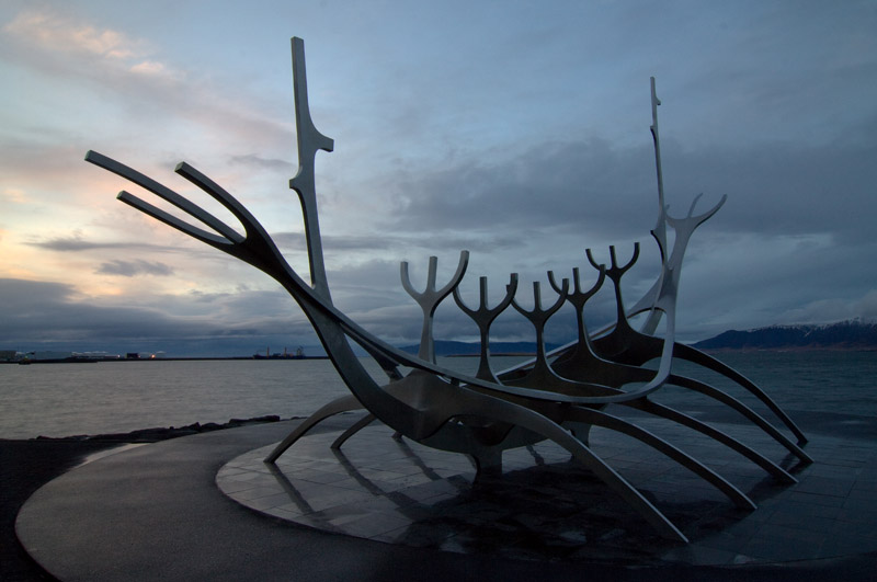 Ich habe dagegen heute nur noch eine Station vor mir, und das ganz ohne Auto: Ich gehe wieder zur Solfar-Skulptur und hoffe, dass die Wolkenlücken, die heute abend immer wieder aufreißen, bis zum Sonnenuntergang bleiben. Leider liegt dann aber über dem Horizont eine dicke Wolkenbank, und die Fotos bleiben leider blass.