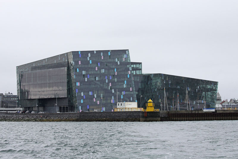 Die Tour ist überraschend richtig gut gebucht, das kleine Schiff füllt sich, und als wir schließlich um kurz nach zehn ablegen, sind unten im Warmen alle Plätze belegt. Während wir aus dem Hafen fahren, geben dann aber doch die meisten Leute ihre Plätze wieder auf, um hinauf auf Deck zu gehen und Fotos zu machen. Ich mache es genauso, fotografieren noch die Harpa und bin ganz guter Dinge, als dann doch der Regen einsetzt und ich wieder hinunter ins Trockene flüchte.