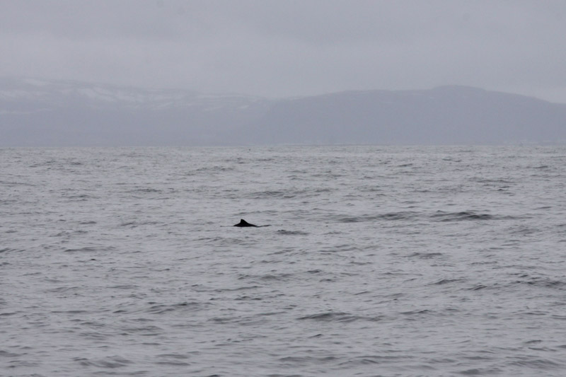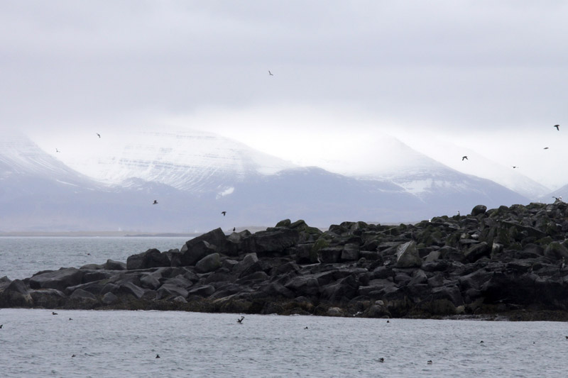 Um das ganze etwas abzukürzen: Es regnet während der gesamten Fahrt, es ist kalt, und obwohl die Sprecherin im Ausguck hysterisch fröhlich ihr bestes tut, uns den Eindruck zu vermitteln, wir befänden uns inmitten spielender Delfine und Wale, sind in Wahrheit doch nur vier oder fünf Rückenflossen zu sehen, eine davon von einem Zwergwal. Auch der in der Fahrt enthaltene Stopp an einem vorgelagerten Vogelfelsen, auf dem auch Papageitaucher brüten sollen, reißt es nicht raus, denn wir sind so weit von den Felsen entfernt, dass man beim besten Willen nicht erkennen kann, ob die kleinen vogelartigen Geschöpfe Papageitaucher oder einfach nur Möwen sind.