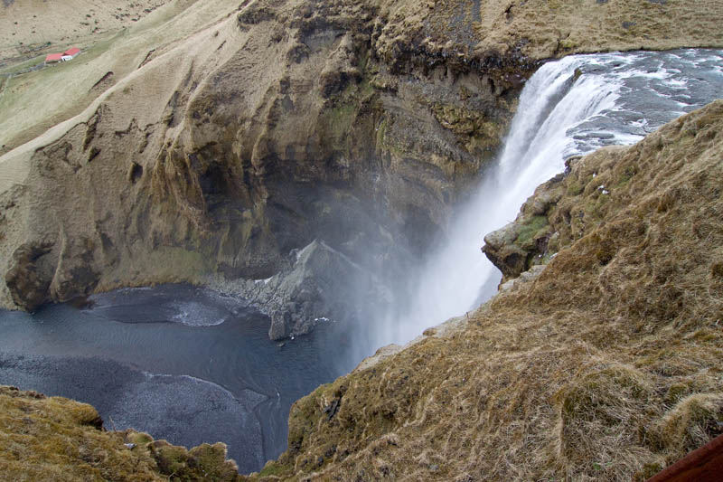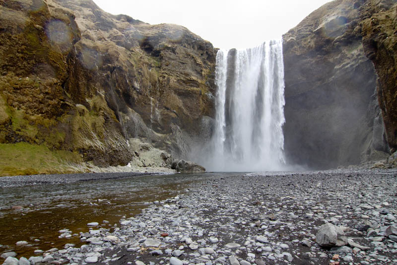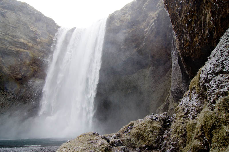 Den Seljalandsfoss will ich aber übermorgen auf der Rückfahrt länger besuchen, wenn die Sonne „richtig“ steht und fahre weiter zum Skogarfoss. Dort gilt das Motto „Mittendrin statt nur dabei“, denn man kann ganz bis nach vorne zum Wasserfall gehen, wenn man denn nichts dagegen hat, nass zu werden. Rundherum sind Gras und Steine gefroren.
