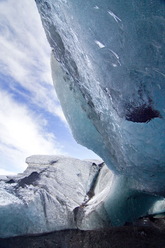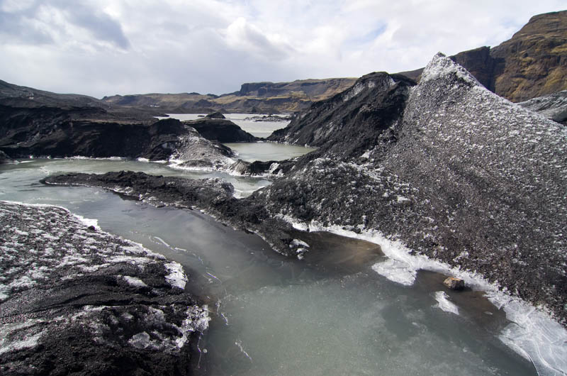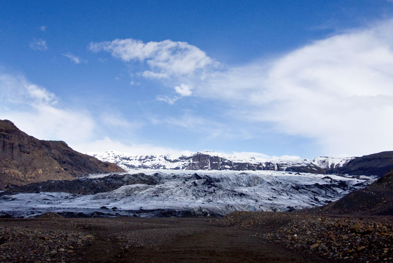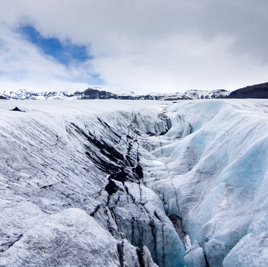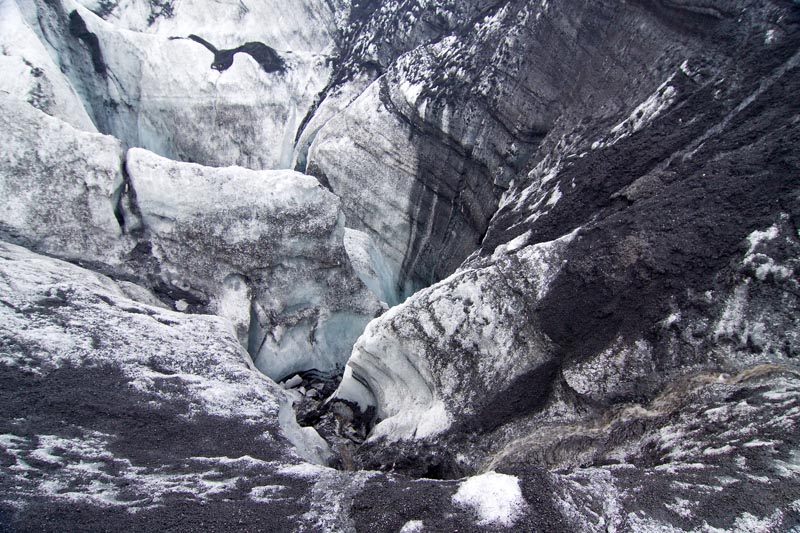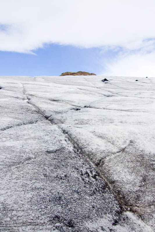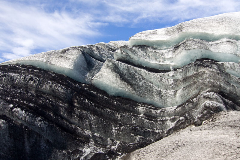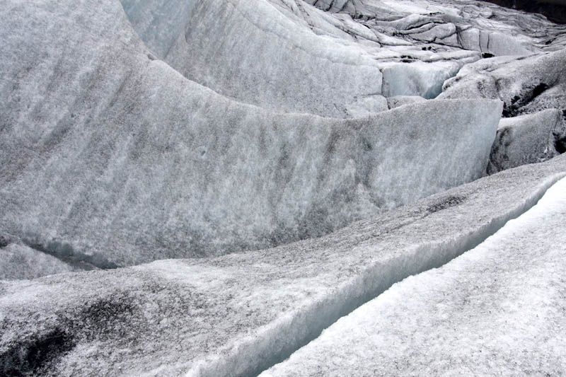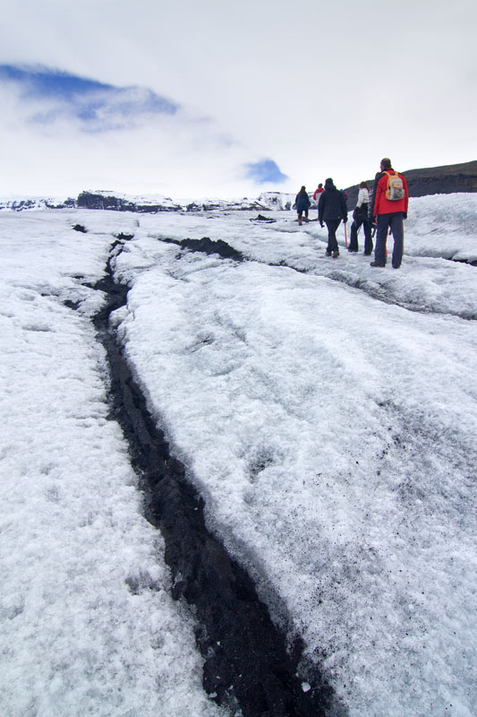 Die ersten Schritte sind noch ungewohnt, und vor allem muss ich mich daran gewöhnen, die Füße nicht vorsichtig und tastend aufzusetzen, sondern im Gegenteil fest die Krampen ins Eis zu drücken. Und das ist hier auf dem ersten Teil der Wanderung auch sehr nötig, denn der Weg ist relativ steil und führt an tiefen Spalten und Verwerfungen vorbei. Oft liegen dichte Ascheschichten auf dem Eis. Unterwegs halten wir immer wieder an, und unsere Führerin erzählt uns Details über den Gletscher, die Gletscherbildung und die Gletscher in Island im allgemeinen. Es gab zur Zeit der ersten Siedler in Island gar keine Gletscher, die Vergletscherung setzte erst mit der „kleinen Eiszeit“ im Mittelalter ein.