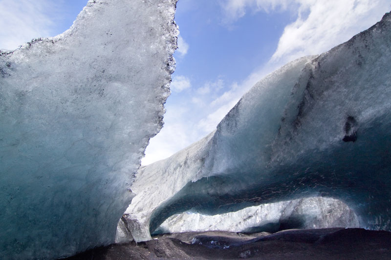 Am Schluss der Wanderung nutze ich dann die Wolkenlücken und mache noch ein paar Fotos an der Gletscherzunge, wo sich auch eine Eishöhle gebildet hat. Müde und kaputt, aber glücklich und mit einem letzten Blick auf den Gletscher marschiere ich dann zum Auto zurück. Trotz der immer noch andauernden Knieschmerzen bin ich froh, dass ich diese Wanderung mitgemacht habe. Das war bisher einer der Höhepunkte meiner Islandreise.