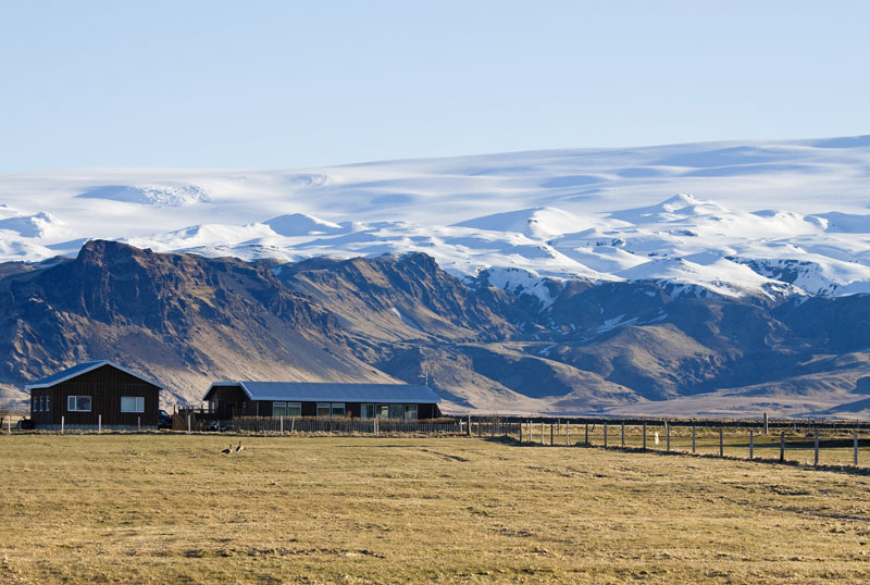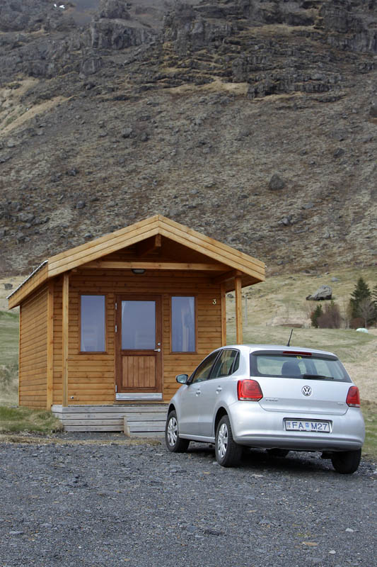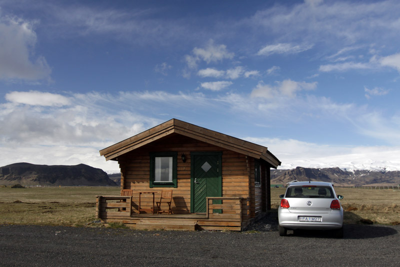 Schließlich fahre ich die Schotterstraße zurück zur Ringstraße und folge ihr weiter bis zur Unterkunft, die ich nicht weit von hier in der Nähe des Kap Dyrholaey gebucht habe. Dieses kleine Holzhäuschen inmitten von Wiesen und Weiden ist für heute Nacht mein Zuhause.