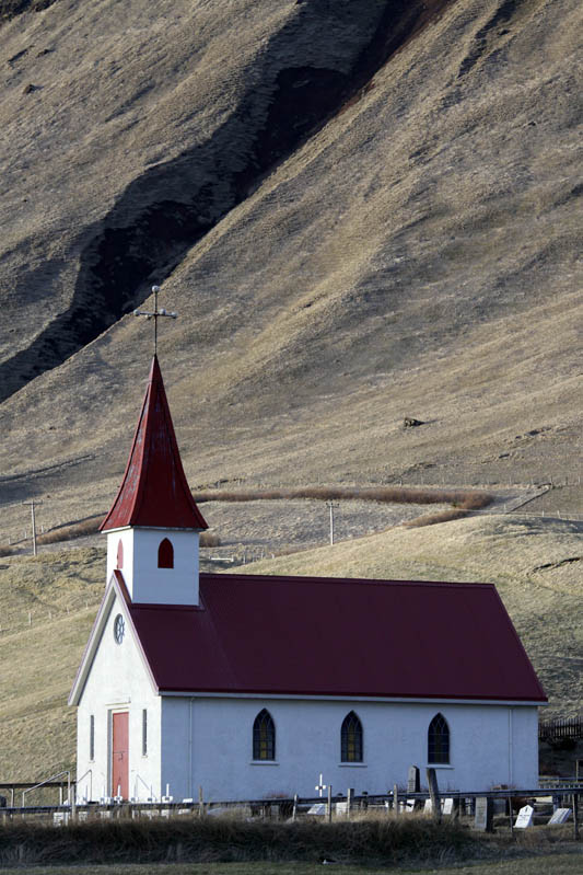 Leider ist es inzwischen wieder sehr kalt und windig, und obwohl der Strand und die bizarren Felsen eine tolle Kulisse sind, will ich nicht noch eineinhalb Stunden bis zum Sonnenuntergang hier warten, sondern fahre nach einem kurzen Fotostopp an einer kleinen Kirche noch weiter bis nach Vik, um einen Blick auf die Reynisdranger von der anderen Seite aus zu werfen. Mittlerweile tun mir die Knie von meinem Sturz richtig weg. Vor allem das rechte, obwohl ich zuerst gedacht hatte, dass ich auf dieser Seite gar nicht so hart aufgeschlagen wäre.