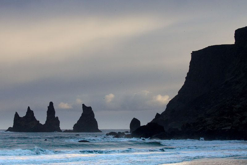 Danach fahre ich noch weiter zum Strand Reynisfjara in der Nähe der Reynisdrangar. Leider versteckt sich die tiefstehende Sonne hinter Wolken, statt für goldene Abendstimmung zu sorgen.