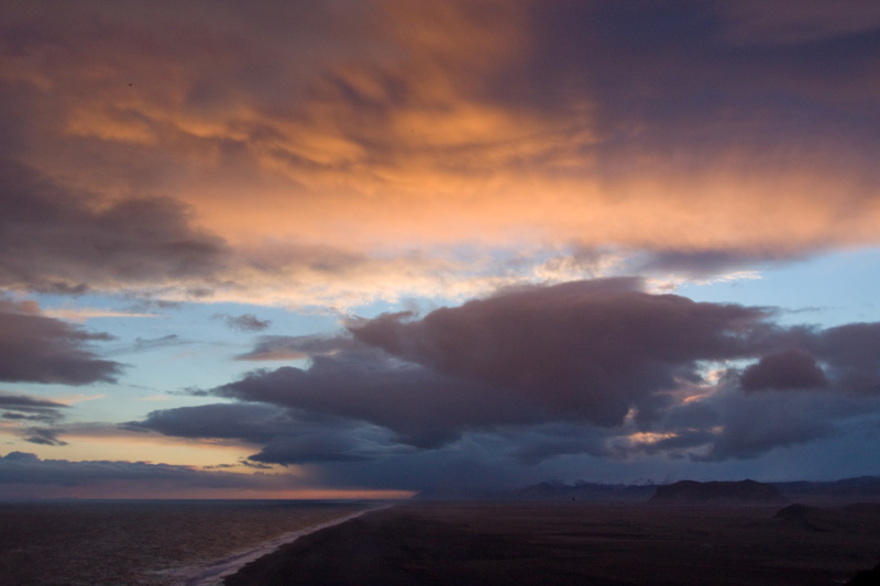 Langsam entstehen am Himmel tolle Wolkenformationen und Lichteffekte, und obwohl ich inzwischen hundemüde bin und mein Humpeln immer mühsamer wird, will ich noch versuchen, ein paar Fotos vom Sonnenuntergang zu machen und fahre nochmal zurück ans Kap Dyrholaey. Bei diesem Himmel kann man doch nicht zurück zur Unterkunft fahren! Über mir scheinen die Wolken in Flammen zu stehen.