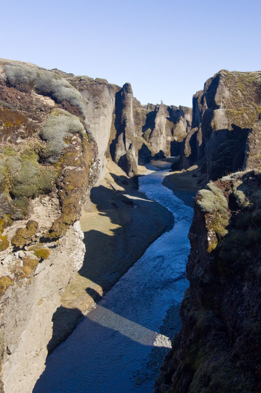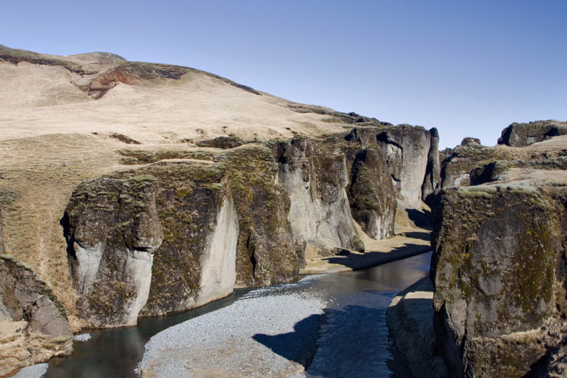 Zuerst versuche ich am Kap Dyrholaey nochmal mein Puffin-Glück, aber wahrscheinlich sind die Puffins schon auf der Arbeit und fangen Fische. Die Felsen sind jedenfalls leer. Also fahre ich weiter Richtung Osten. Kurz vor einem Ort mit dem übungsbedürftigen Namen Kirkjubaejarklaustur biege ich von der Ringstraße ab und erreiche über eine Schotterstraße eine Schlucht mit dem nicht weniger übungsbedürftigen Namen Fjardrargljufur. Immer noch lacht die Sonne vom Himmel, und die Schlucht ist ein tolles Fotomotiv.