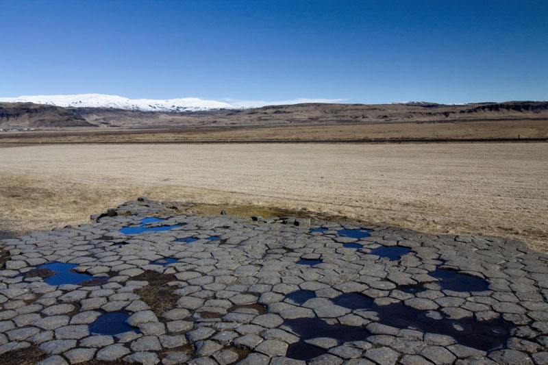 Danach spaziere ich bei Kirkjubaejarklaustur noch zu einer Stelle in einer Wiese, in der von Gletschern abgeschliffene Basaltsäulen einen Fläche wie einen Fußboden formen, so dass diese Stelle früher anscheinend für einen Kirchenfußboden gehalten wurde oder zumindest so genannt wird.