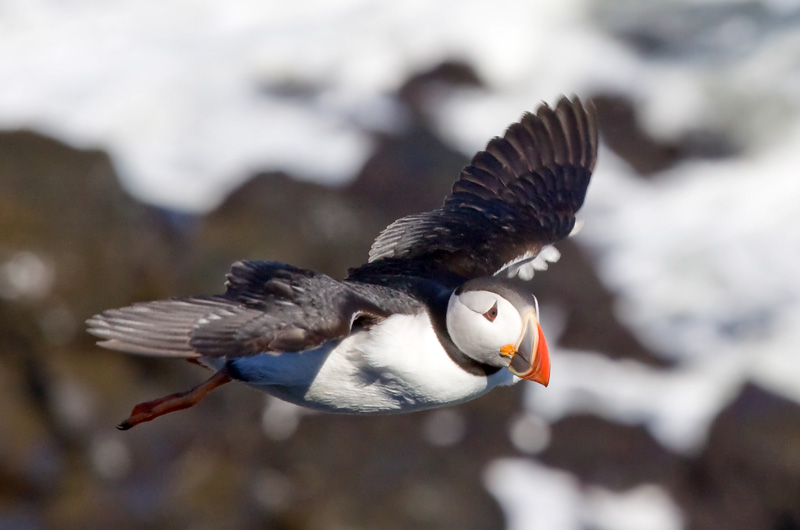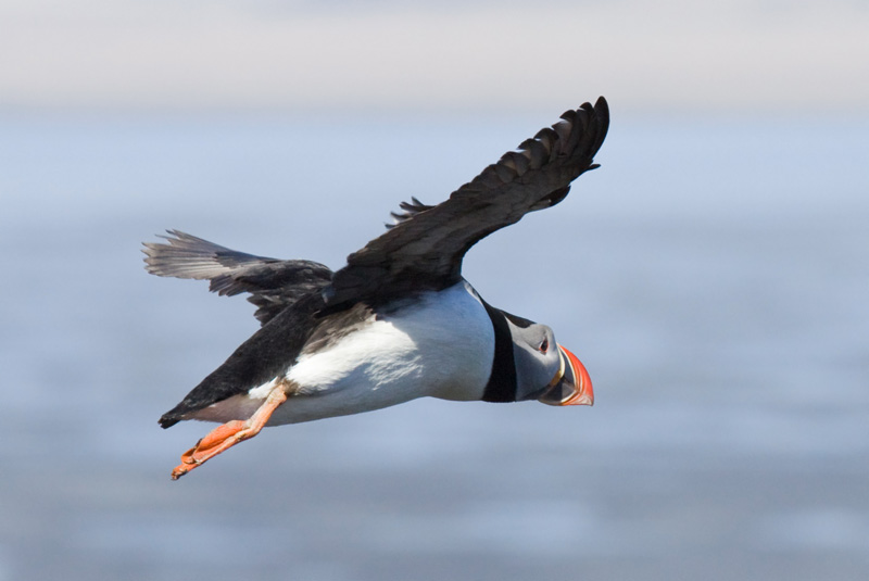 Ich kann nicht verhindern, dass mir ein verzücktes „Puffin!“ entfährt. Die Verzückung beruht allerdings offensichtlich nicht auf Gegenseitigkeit, denn der Puffin fliegt weg. Vielleicht weiß er, dass ich vor ein paar Tagen einen Kumpel von ihm gegessen habe. Aber ein paar Meter weiter sitzt noch ein anderer. Inzwischen komme ich nur noch mühsam vorwärts, weil sich mein rechtes Knie irgendwie nicht mehr richtig beugen lässt, aber wer weiß, ob ich nochmal einen Puffin sehen werde. Also kämpfe ich mich die letzten Meter zum Kofferraum, hole das Teleobjektiv, setze die ISO-Zahl hoch und gehe auf Puffin-Pirsch. Und ja, ich habe Glück: