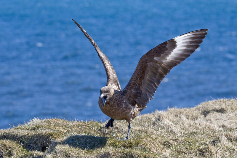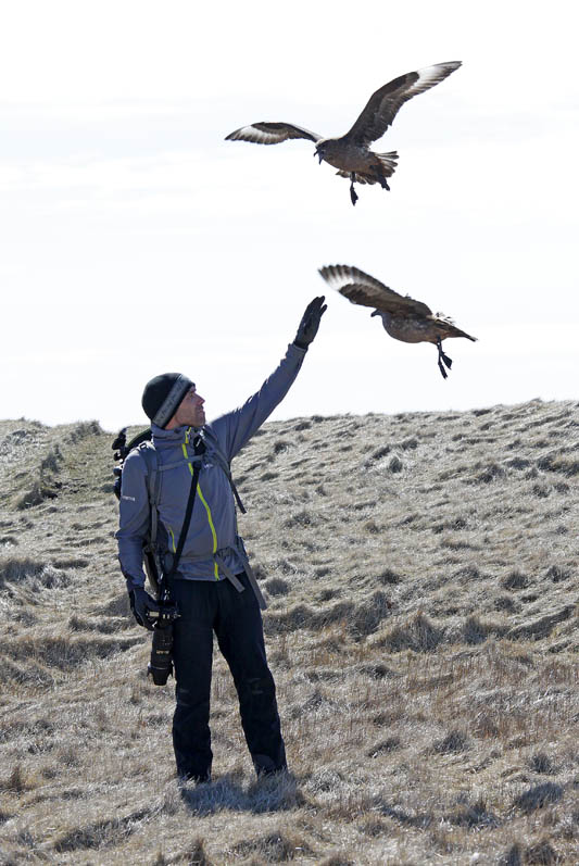Andere Vögel sind da wehrhafter. Die Skuas, die Raubmöwen, haben ein festes Territorium und mögen es gar nicht, wenn man ihnen und ihren Nestern zu nahe kommt, was der Guide dankenswerterweise für uns demonstriert. Offenbar kennen er und das Skua-Weibchen sich schon lange: Wenn ich es richtig verstanden habe, werden Skuas nämlich ziemlich alt, und dieser Vogel ist schon etwa 40 Jahre alt, genau wie der Guide.