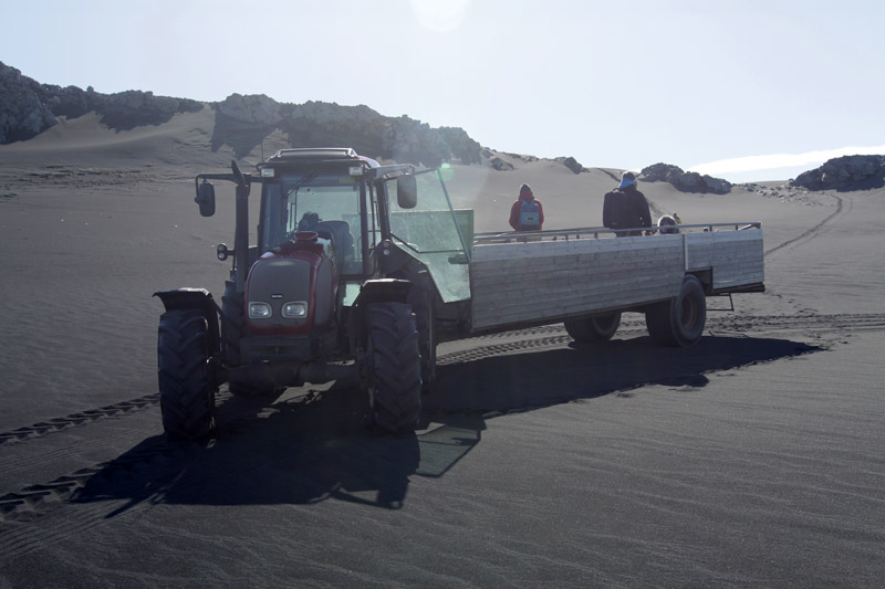Außer mir haben noch ein paar andere Urlauber den Weg hierher gefunden. Wir steigen in einen großen Anhänger, und dann geht die Fahrt mit dem Traktor ein knappe halbe Stunde lang durch Wasser und Sand, denn der Felsen ist nur so erreichbar. Mir gefällt der Ausflug jetzt schon.