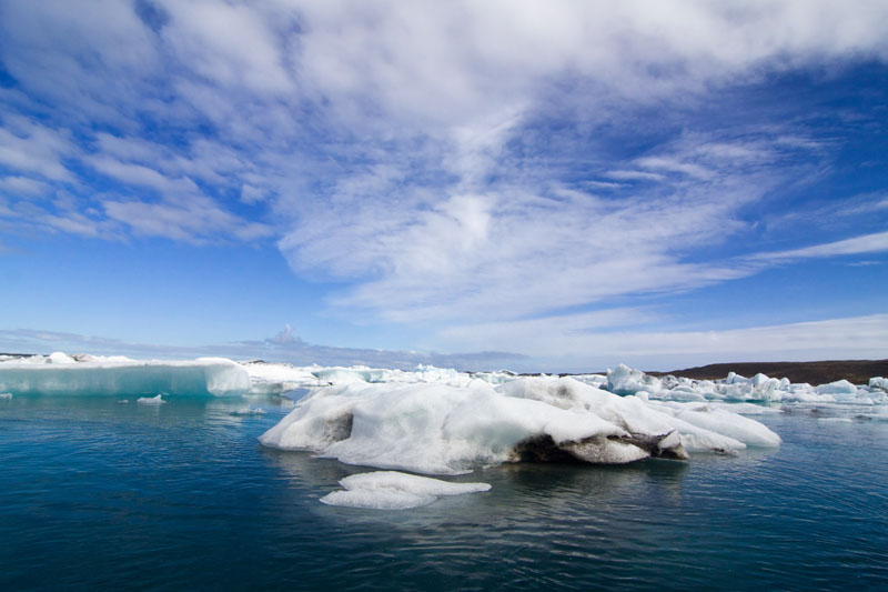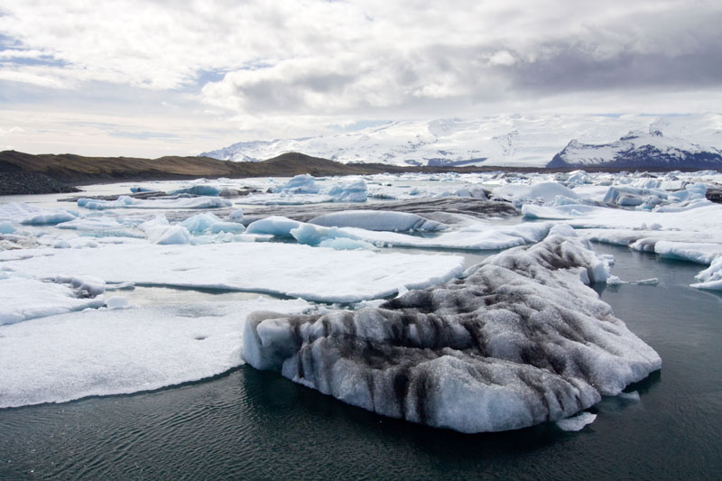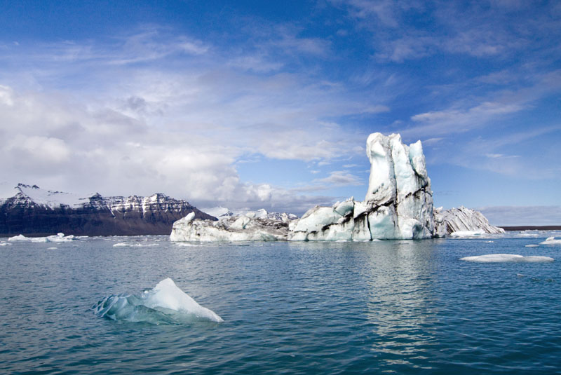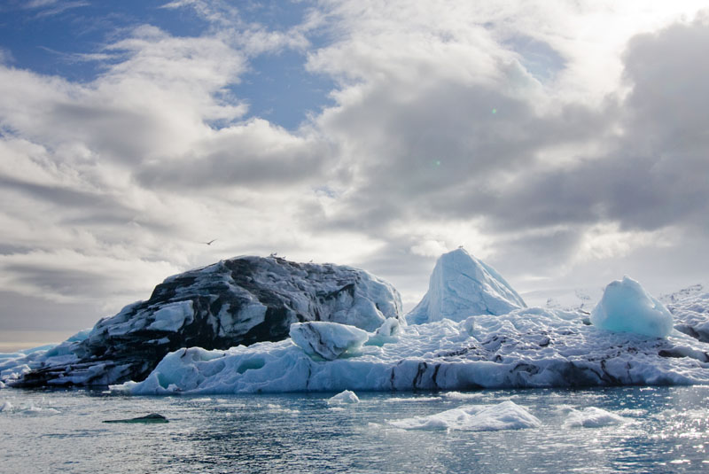 Es war ein toller Ausflug, und ich bedanke mich nochmal begeistert bei unserem Guide, bevor ich mich wieder ins Auto schwinge: Noch etwa eine halbe Stunde Richtung Osten fahre ich weiter auf der Ringstraße, bevor ich Jökulsarlson, die Eisberglagune, erreiche. Der Gletscher, der hier vor einigen Jahrzehnten noch fast bis ans Meer reichte, hat sich inzwischen weit zurückgezogen und eine tiefe Lagune hinterlassen, in der kleine und größere Eisberge schwimmen, schmelzen und langsam über einen nur 1500 m langen Fluss das Meer erreichen.