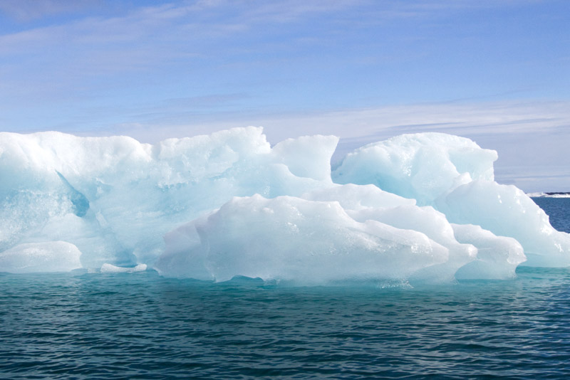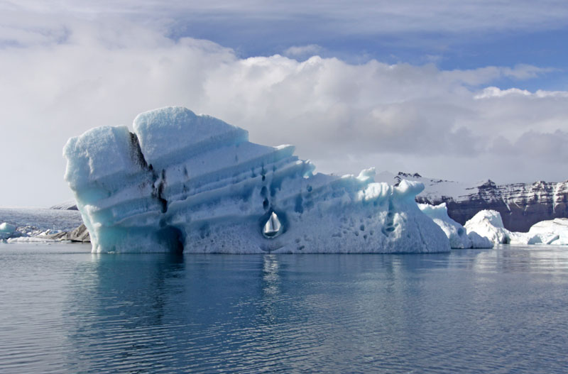 Der Guide erklärt, dass die Lagune tief ist, nämlich über 200 m, und anscheinend reicht das Wasser bis unter das Gletschereis und trägt es bei Flut und Ebbe immer ein wenig hoch und hinunter. Wenn man sich anschaut, wie hoch die Eiswand an der Gletscherzunge hinaufragt und wie hoch einige Eisberge sind und sich überlegt, dass sich nur 1/7 des Eises über Wasser befindet, wird einem so langsam klar, wie tief das Eis noch hinunter ins Wasser ragt.