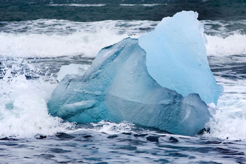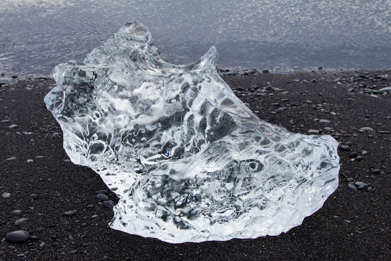 Das angegebene Museum mit angeschlossenem Restaurant ist auch bald gefunden, aber oh Schreck: Es ist eins dieser Etablissements mit Stofftischdecken (schock), wo man nette Dinge wie Lammschulter zu essen bekommt. Ich dagegen habe statt einer Frisur nur noch Gestrüpp auf dem Kopf und trage eine an den Knien kaputte und an den Fersen ziemlich vollgeschlammte Wanderhose. Aber zu spät, jetzt bin ich schon drin, und netterweise empfiehlt mir der junge Kellner, doch einfach die Suppe des Tages zu nehmen und serviert mir die Suppe dann auch noch in einem Teller, der Schüsselgröße hat. Gesättigt, aufgewärmt und halbwegs ausgeruht fahre ich dann wieder zurück zum Jökulsarlon und spaziere hinunter an den Strand, wo bizarr geformte Eisbrocken im schwarzen Sand schmelzen oder ins Meer getrieben werden.