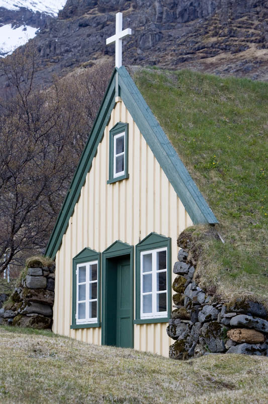 Schade, dass die Sonne inzwischen hinter dichten Wolken versteckt ist. Dass ich mit dem Wetter aber noch ziemliches Glück hatte, merke ich eine halbe Stunde später, als ich endlich in einem kleinen Ort namens Hof nahe am Skaftafell Nationalpark ankomme und dort eine kleine Hütte beziehe. Ich schaffe es gerade noch, die kleine Kirche zu fotografieren, da fallen schon die ersten Regentropfen.